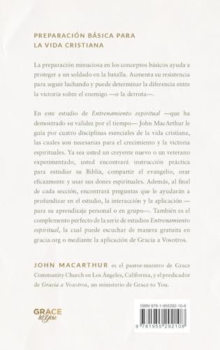 En Entrenamiento espiritual, John MacArthur le guía a través de cuatro disciplinas esenciales de la vida cristiana, necesarias para el crecimiento espiritual y la victoria.Hay una razón por la que los soldados van al campo de entrenamiento antes de entrar en combate. Entrenarse en lo básico ayuda a refinar sus habilidades para permanecer en la lucha. Considérese reclutado en un campo de entrenamiento práctico para la vida cristiana. La guía de estudio de John MacArthur, Entrenamiento espiritual, le lleva a través de un curso de cuatro partes sobre las disciplinas cristianas necesarias para el crecimiento espiritual. En esta serie descubrirá pautas prácticas para estudiar la Biblia, comunicar el evangelio a otros, orar más eficazmente y usar sus dones espirituales.En este estudio de Entrenamiento espiritual -que ha demostrado su validez por el tiempo- John MacArthur le guía por cuatro disciplinas esenciales de la vida cristiana, las cuales son necesarias para el crecimiento y la victoria espirituales. Ya sea usted un creyente nuevo o un veterano experimentado, usted encontrará instrucción práctica para estudiar su Biblia, compartir el evangelio, orar eficazmente y usar sus dones espirituales. Además, al final de cada sección, encontrará preguntas que le ayudarán a profundizar en el estudio, la interacción y la aplicación -para su aprendizaje personal o en grupo-. También es el complemento perfecto de la serie de estudios Entrenamiento espiritual, la cual puede escuchar de manera gratuita en gracia.org o mediante la aplicación de Gracia a Vosotros.